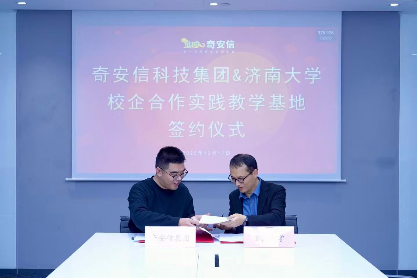 随后的签约仪式上,张海鵾表示,学校以社会需求为导向,积极推动产教融合,将网络空间安全专业作为重点发展方向,需与领军企业深度合作。与奇安信集团的合作将助力优化课程体系、加强师资建设、升级实践平台,为学生提供更贴近产业的学习环境。荆山介绍了学院在网络空间安全领域的学科建设与人才培养进展,希望通过合作贯通从理论教学到工程实践的全链条,提升学生的实战能力。