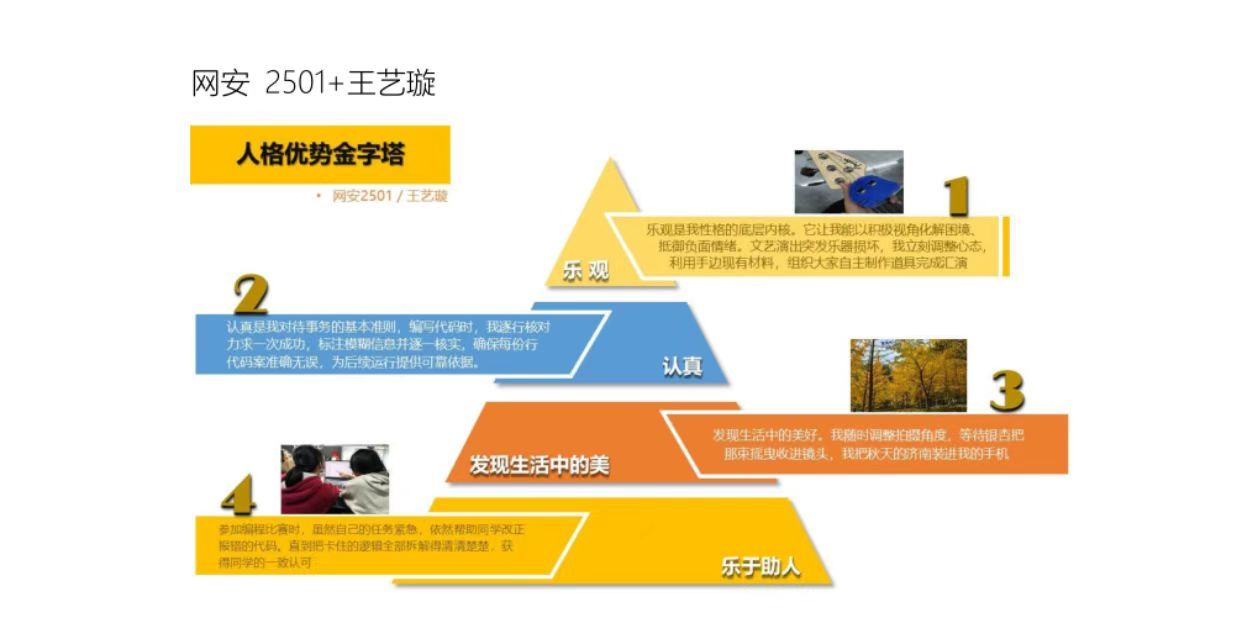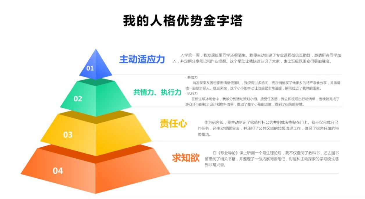 活动中,同学们循着“认知—梳理—构建—践行”的路径,逐步完成属于自己的“人格优势金字塔”搭建。在优势探索环节,大家通过心理测评、同伴互评、成长复盘等多元方式,挖掘出自身隐藏的潜能优势,从“善于倾听”“逻辑清晰”到“抗压能力强”“创意丰富”,每一项优势的梳理都让同学们对自我有了更清晰的认知。在金字塔构建环节,大家将筛选出的核心优势分层排序,用色彩与文字勾勒出专属的优势图谱,不少同学在分享时感慨:“原来我有这么多没发现的闪光点,这让我对未来的学习生活更有底气了。”